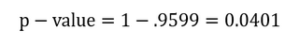 באמצעות טבלת התפלגות נורמלית [לינק פנימי] (טבלת זד), נוכל למצוא את השטח המצטבר של Z=1.75. אחד מינוס השטח שיימצא, ייתן לנו את השטח של הזנב הימני של ההתפלגות (כפי שניתן לראות בתרשים). מכיוון שההתפלגות הנורמלית היא סימטרית, השטח של הזנב הימני יהיה שווה לשטח של הזנב השמאלי וייתן לנו את ערך הp: